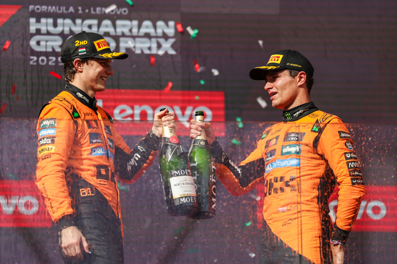新华社照片,布达佩斯,2025年8月4日\n 8月3日,冠军迈凯伦车队英国车手诺里斯(右)和亚军澳大利亚车手皮亚斯特里在颁奖仪式上庆祝。\n 当日,2025赛季世界一级方程式赛车锦标赛(F1)匈牙利大奖赛正赛在匈牙利首都布达佩斯附近的亨格罗林赛道举行。迈凯伦车队英国车手诺里斯夺冠,迈凯伦车队澳大利亚车手皮亚斯特里和梅赛德斯车队英国车手拉塞尔分获亚、季军。\n 新华社发(钱俊摄)